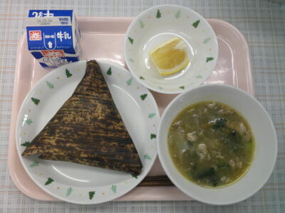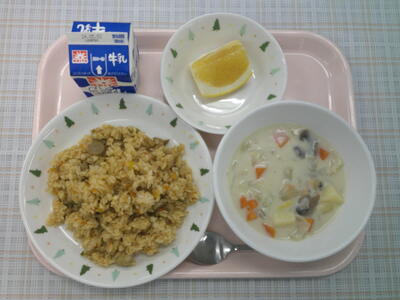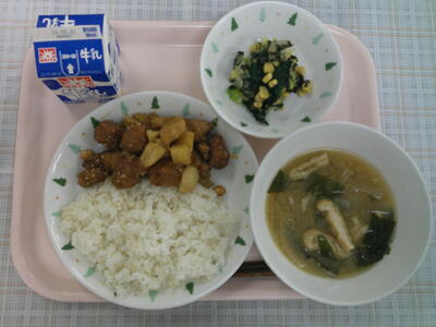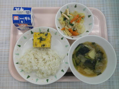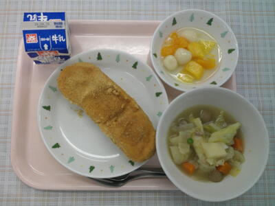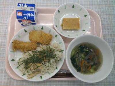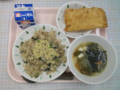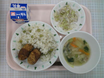 ・ピースごはん・ポテトコロッケ・あっさりスープ・ゆかり和え