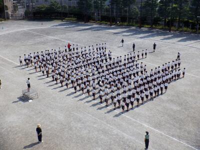 写真は4階から整列の様子を撮影したものとラジオ体操の様子です。