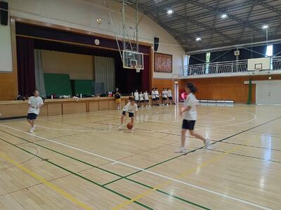 写真は、体育館内で大縄跳びの練習を行っている様子です。