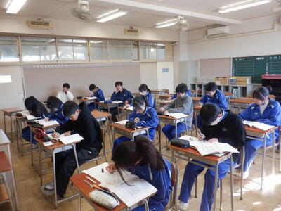 今日は都内私立高校の推薦入試でした。登校した生徒の人数は少なかったですが、お互いに面接練習をしたり、来週の都立高校推薦入試に向けて、最終確認をしていました。